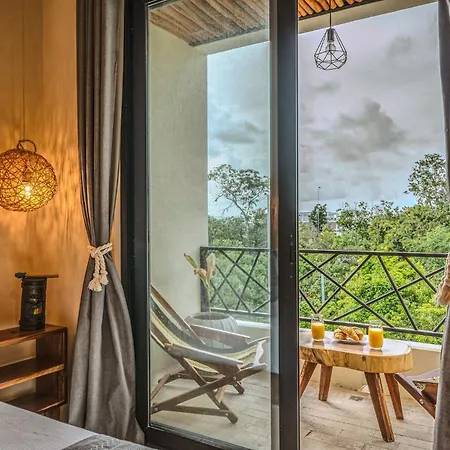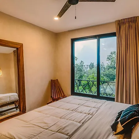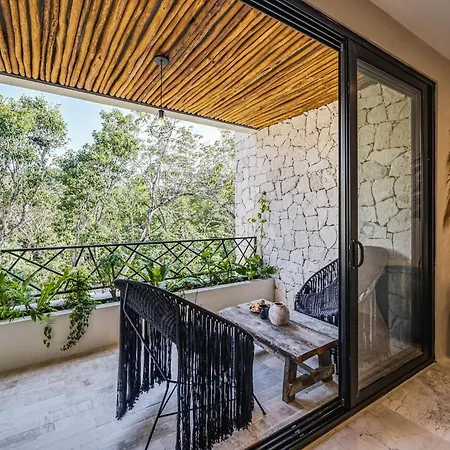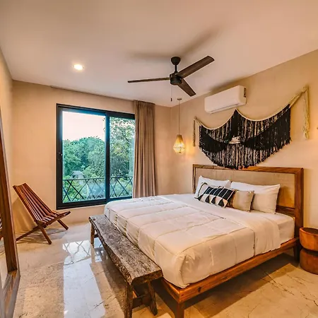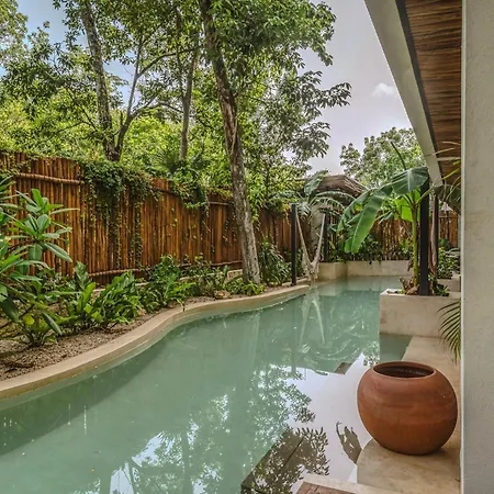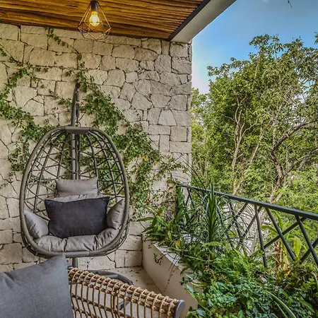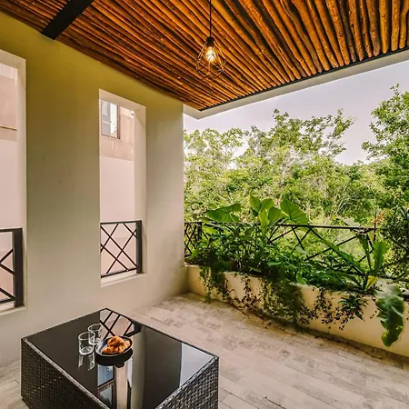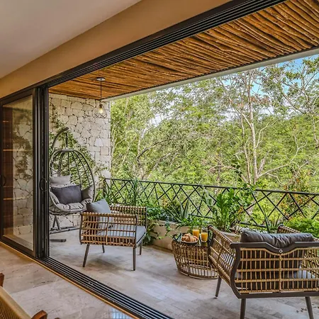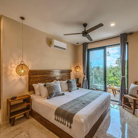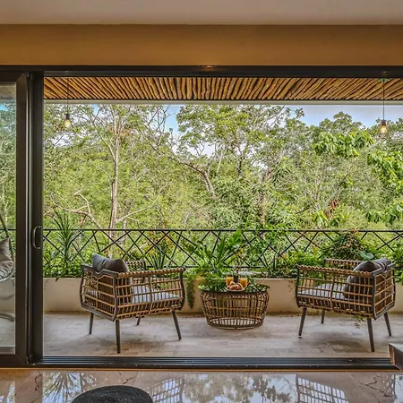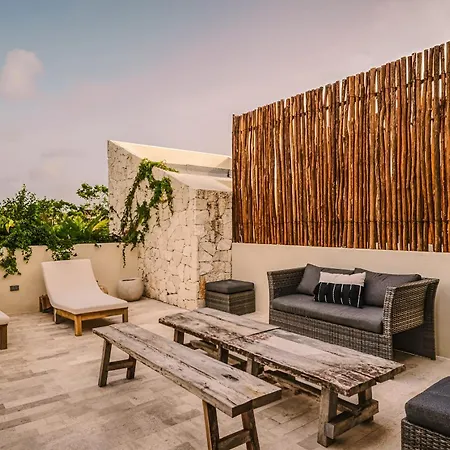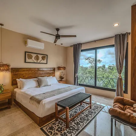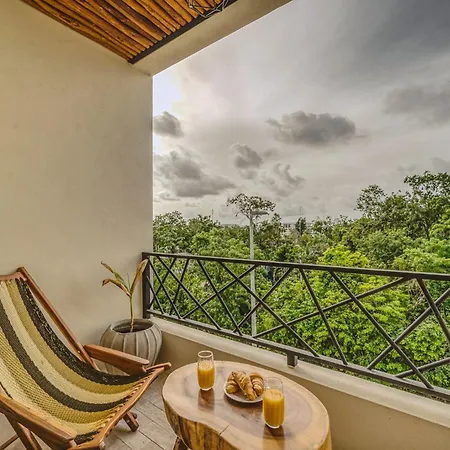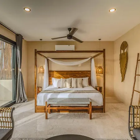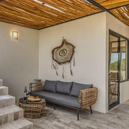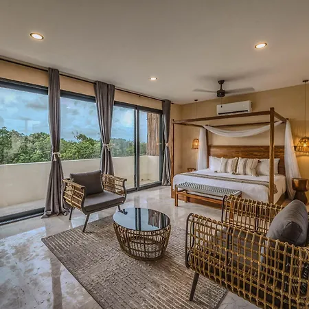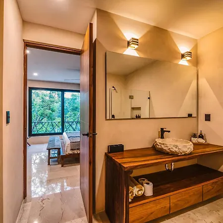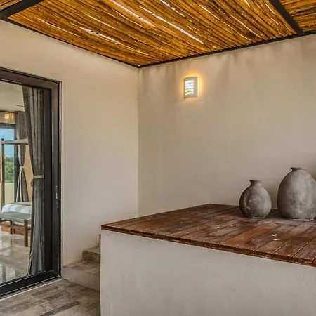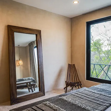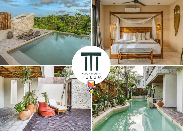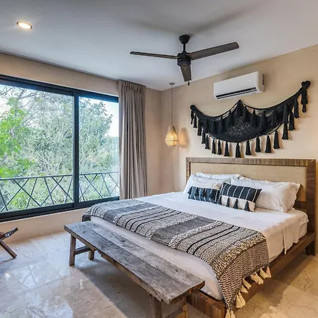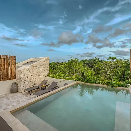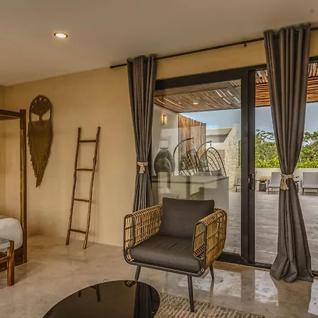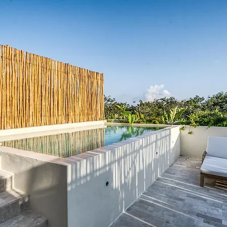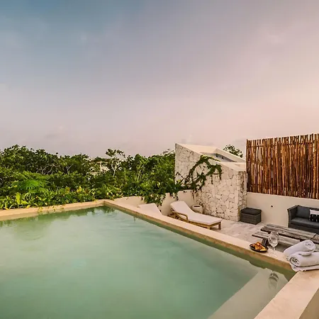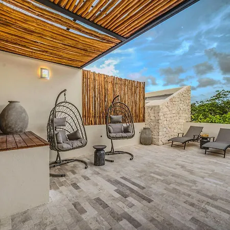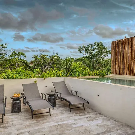 The spacious 520 m² Deluxe 6Br Double Penthouse With 2 Private Roof Pools Apartment Tulum, located in the Zama district, around a 10-minute ride from the Tulum Archaeological Site, features views of the garden. The 6-bedroom apartment entices guests with loungers, ensuring ultimate comfort by the swimming pool.